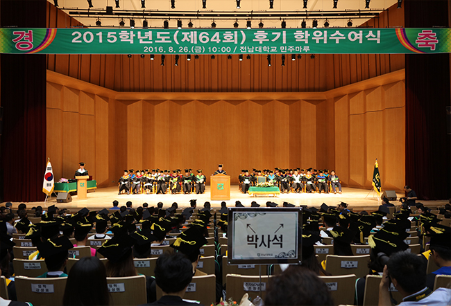 전남대학교(총장 지병문) ‘2015학년도 후기학위수여식’이 8월 26일(금) 오전 10시 교내 민주마루(구 대강당)에서 졸업생과 가족, 교직원 및 재학생, 동문 등 1,500여 명이 참석한 가운데 성대하게 치러졌다.