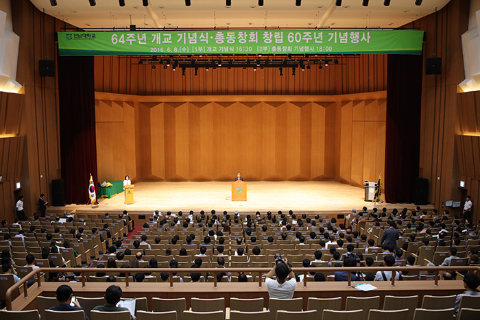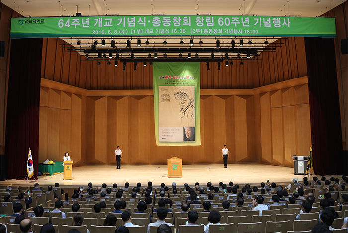 전남대학교(총장 지병문) 개교 64주년 기념식이 6월 8일(수) 오후 4시30분 교내 민주마루(구 대강당)에서 교직원과 동문, 학생, 지역민 등 400여 명이 참석한 가운데 개최된다.
