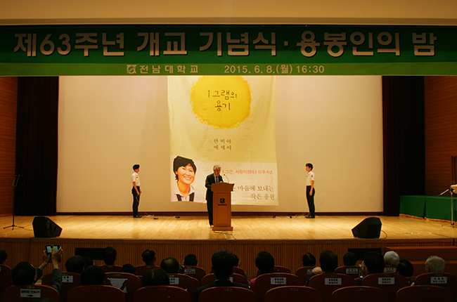 전남대학교는 8일(월) 오후 열린 ‘제63주년 개교기념식’에서 광주·전남 시·도민이 올 한 해 함께 읽고 토론할 ‘2015 한책’으로 한비야 작가의 『1그램의 용기』를 선정했다고 선포했다.